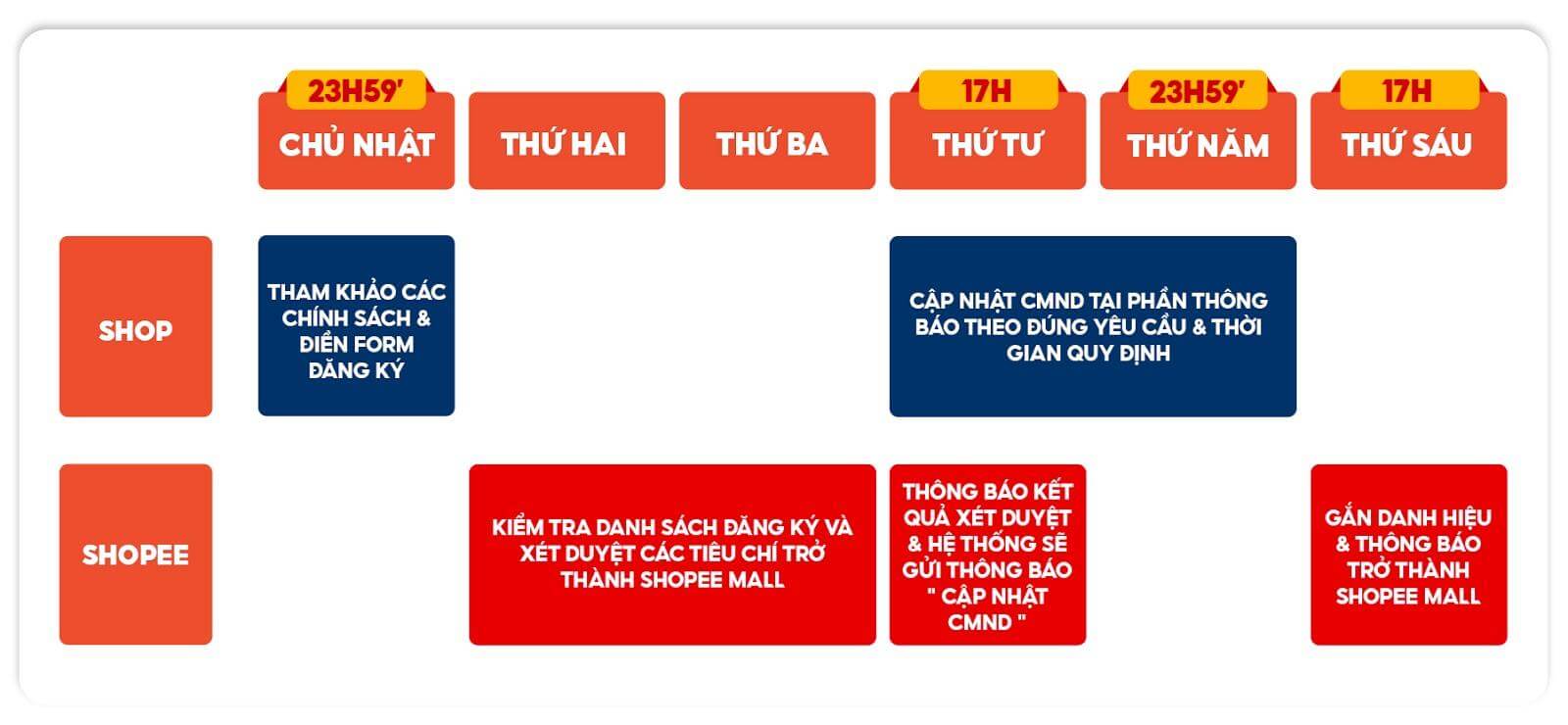 Vào 17h thứ sáu hàng tuần, Shopee sẽ gắn danh hiệu Shopee Mall khi CMND cập nhật được phê duyệt và sẽ gửi thông báo đến Shop.